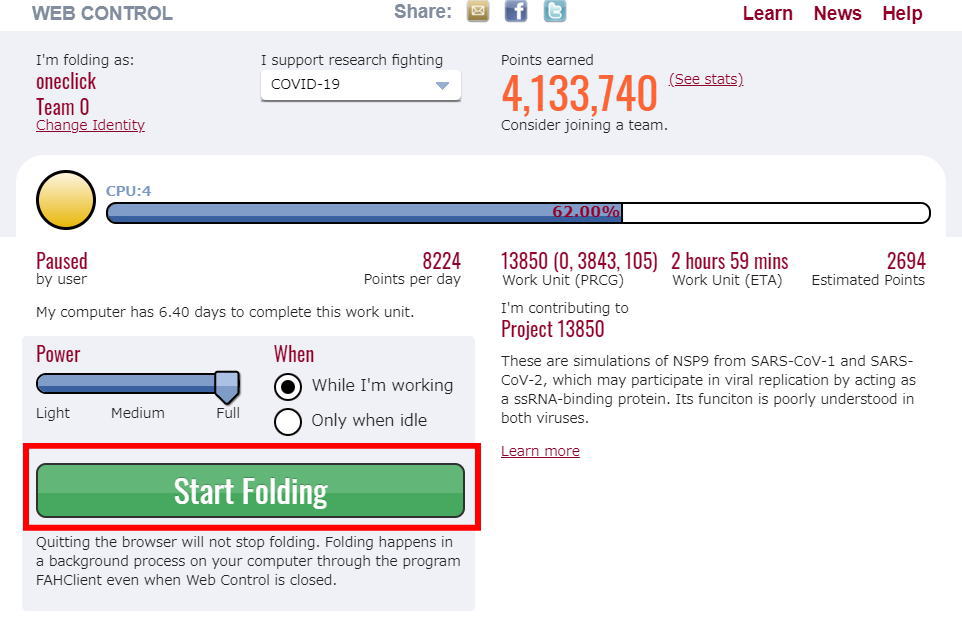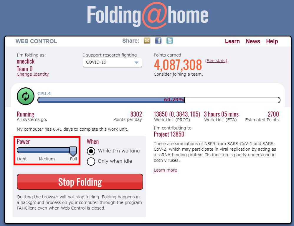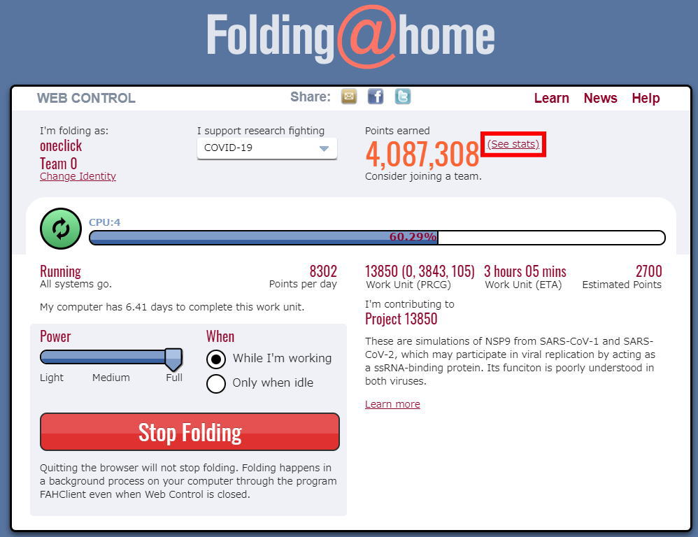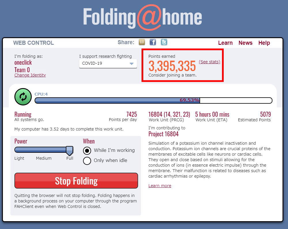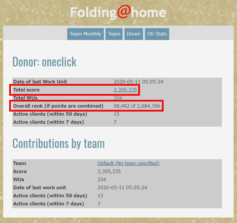 ¥³¥í¥Ê¿·Ìô³«È¯¥×¥í¥¸¥§¥¯¥È(Folding@home)¤Î¡Ö¥Á¡¼¥àoneclick¡×¤Ë¤´»²²Ã¤¤¤¿¤À¤±¤Þ¤¹¤È¡¢³§¤µ¤ó¤È°ì½ï¤ËãÀ®¤·¤¿¹ç·×ÆÀÅÀ¤¬É½¼¨¤µ¤ì¤Þ¤¹¡£